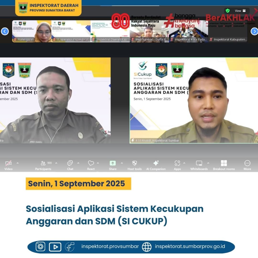 Padang, 1 September 2025 – Pemerintah Provinsi Sumatera Barat melalui Sekretariat Daerah menyelenggarakan Sosialisasi Aplikasi Sistem Kecukupan Anggaran dan SDM (SI CUKUP) secara daring melalui Zoom Meeting.