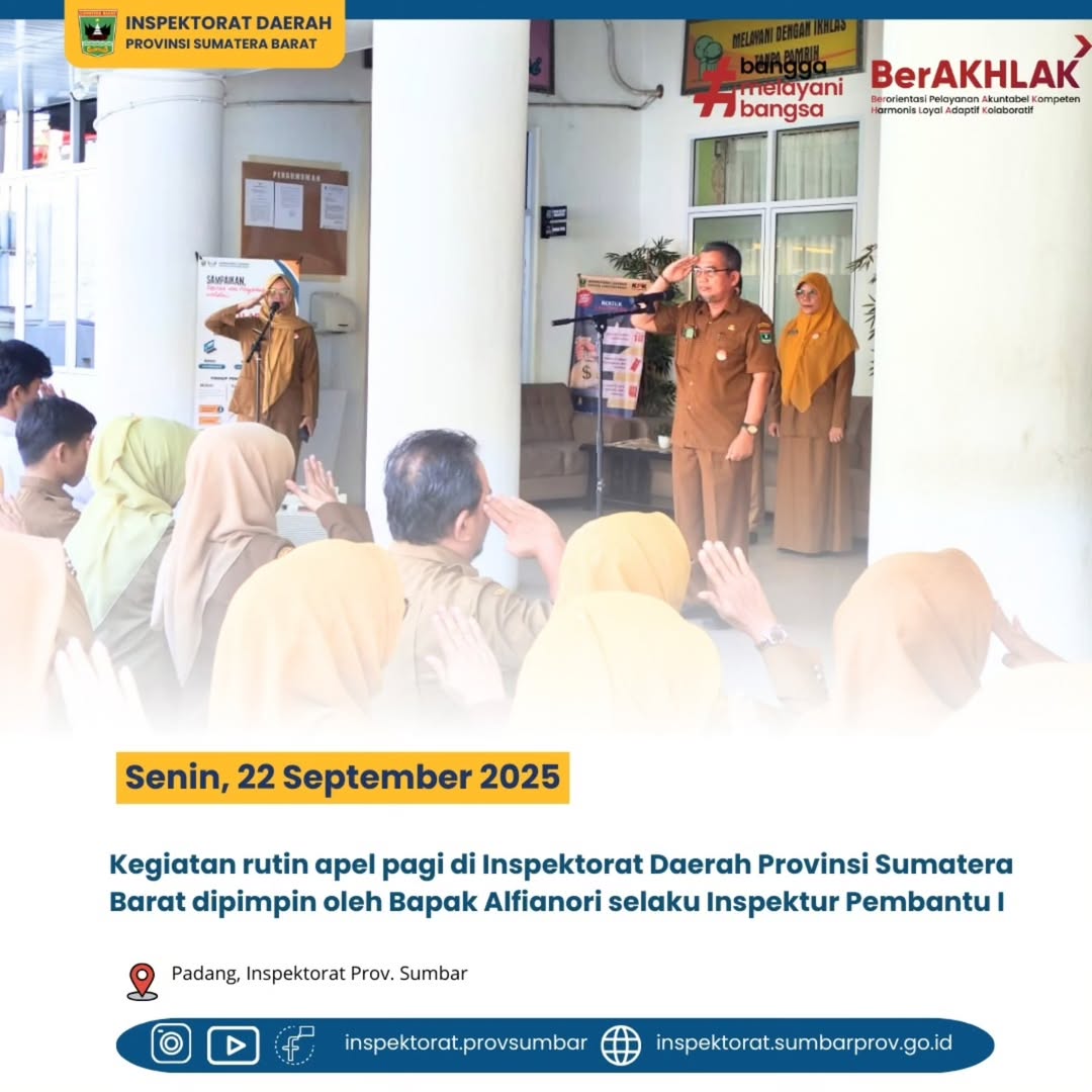 Padang, Senin 22 September 2025 – Inspektorat Daerah Provinsi Sumatera Barat menggelar apel pagi rutin yang diikuti oleh seluruh Aparatur Sipil Negara (ASN). Kegiatan berlangsung tertib, khidmat, serta menjadi sarana memperkuat kebersamaan dan tanggung jawab bersama. Inspektur Pembantu I, Bapak Alfianori, S.Sos, selaku pemimpin apel, memberikan arahan mengenai pentingnya menjaga disiplin, integritas, serta meningkatkan kinerja dalam mendukung tugas pengawasan.