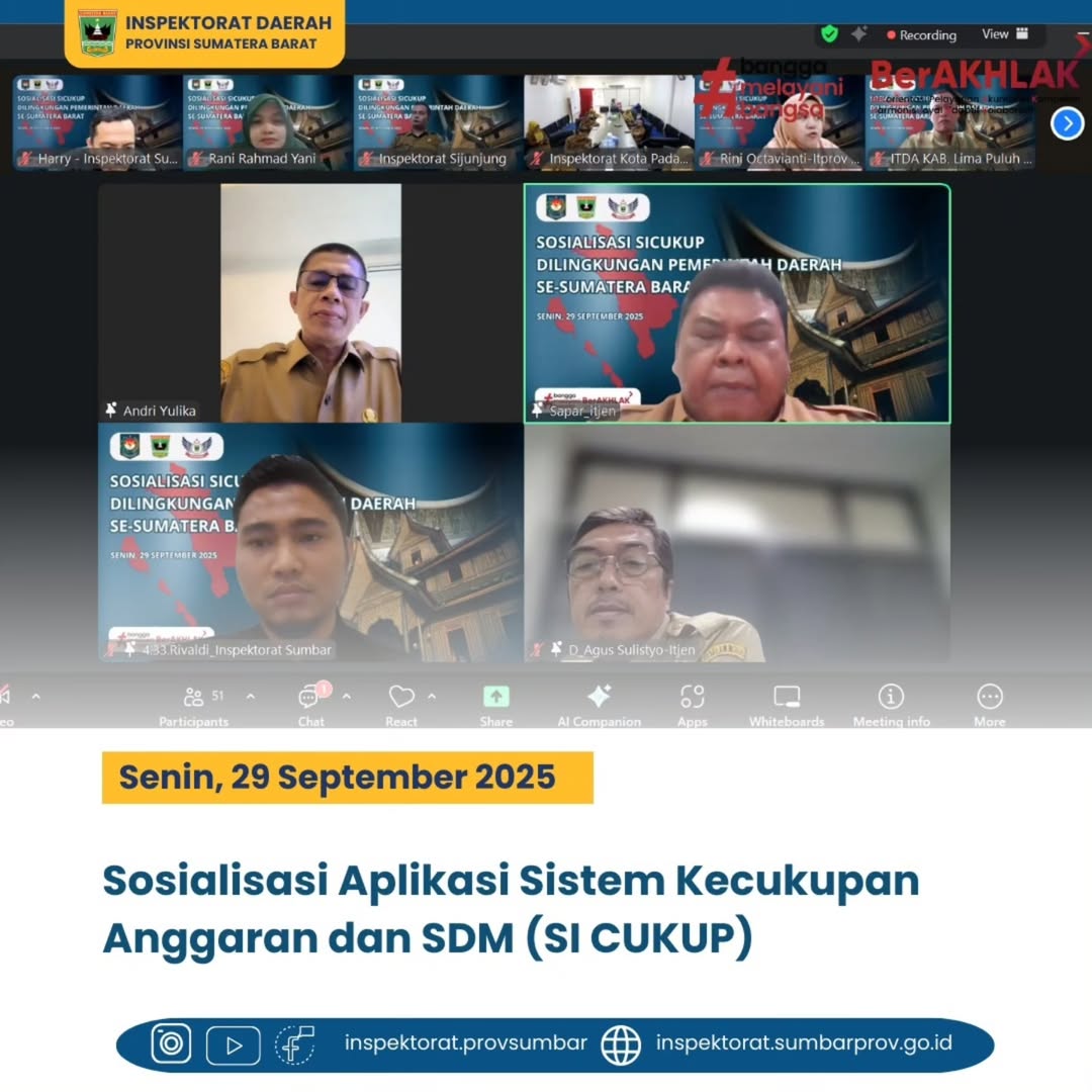 Padang, Senin 29 September 2025 – Inspektorat Daerah Provinsi Sumatera Barat memfasilitasi Sosialisasi Aplikasi Sistem Kecukupan Anggaran dan SDM (SI CUKUP) yang disampaikan oleh Tim Inspektorat Jenderal Kementerian Dalam Negeri secara daring melalui Zoom Meeting.