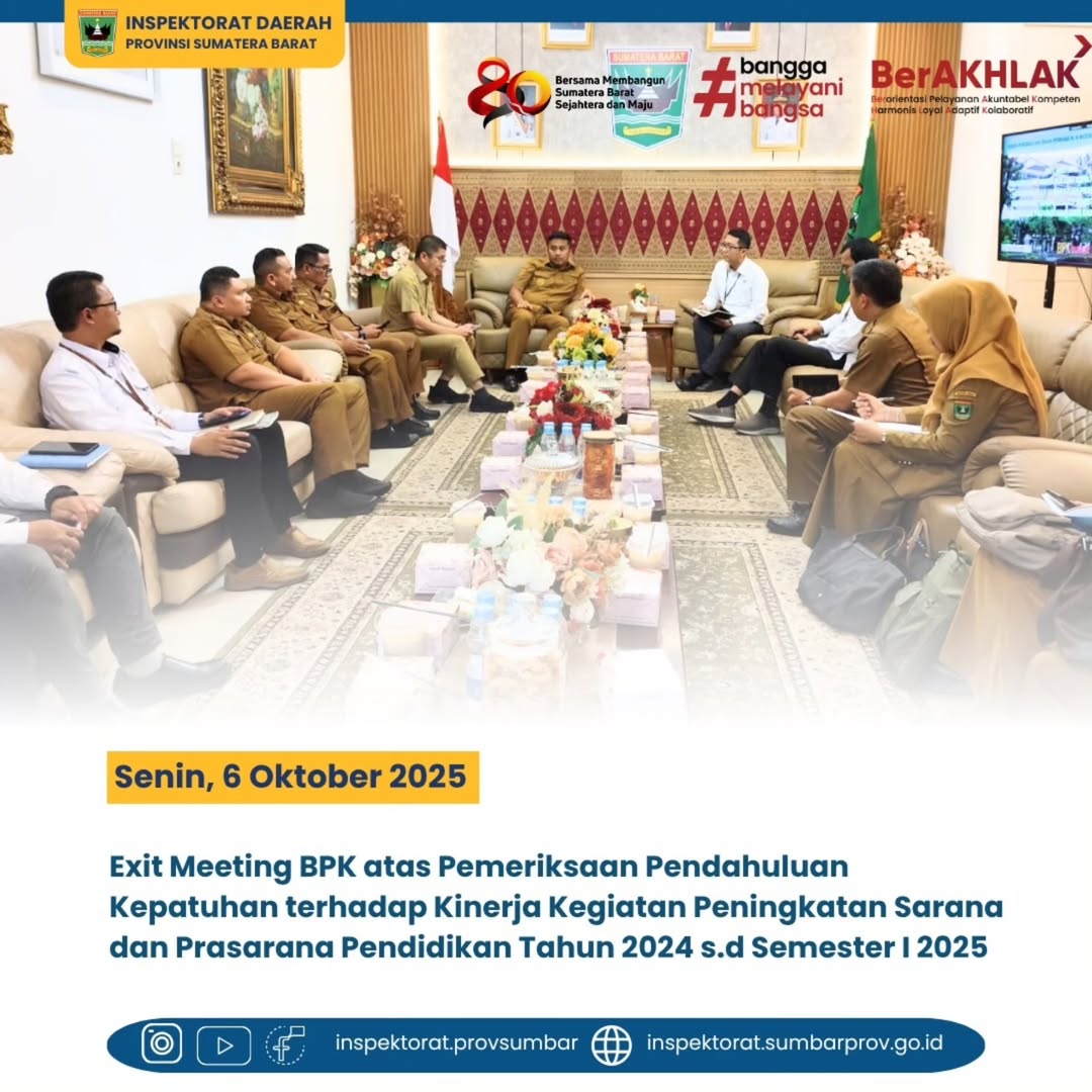 Exit Meeting dipimpin oleh Bapak Wakil Gubernur dan dimoderatori oleh Inspektur Daerah Provinsi Sumbar. Dalam pertemuan tersebut, BPK menyampaikan gambaran awal terkait pemeriksaan yang telah dilaksanakan selama kurang lebih 30 hari. Selama proses pemeriksaan BPK mengapresiasi Pemprov Sumbar yang telah membantu dalam hal koordinasi terkait data dan dokumen yang dibutuhkan selama proses pemeriksaan. Adapun pemeriksaan terinci akan dijadwalkan pada tanggal 13 Oktober 2025.