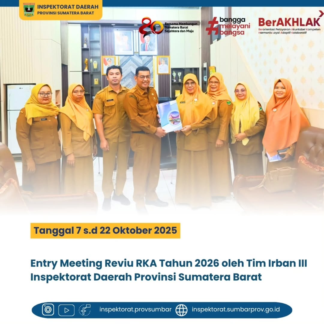 Tim Irban III Inspektorat Daerah Provinsi Sumatera Barat yang dipimpin oleh Ibu Rahmah Febri Yeni melaksanakan Entry Meeting Reviu Rencana Kerja dan Anggaran (RKA) Tahun 2026 pada beberapa OPD di lingkungan Pemerintah Provinsi Sumatera Barat, yaitu Biro Kesra, Disbud, DP3AP2KB, Dinkes, Dispora, BPBD, DPMD, Dinas Sosial, RS Jiwa HB Saanin, RSAM Bukittinggi, dan RSUD Prof. M. Yamin.