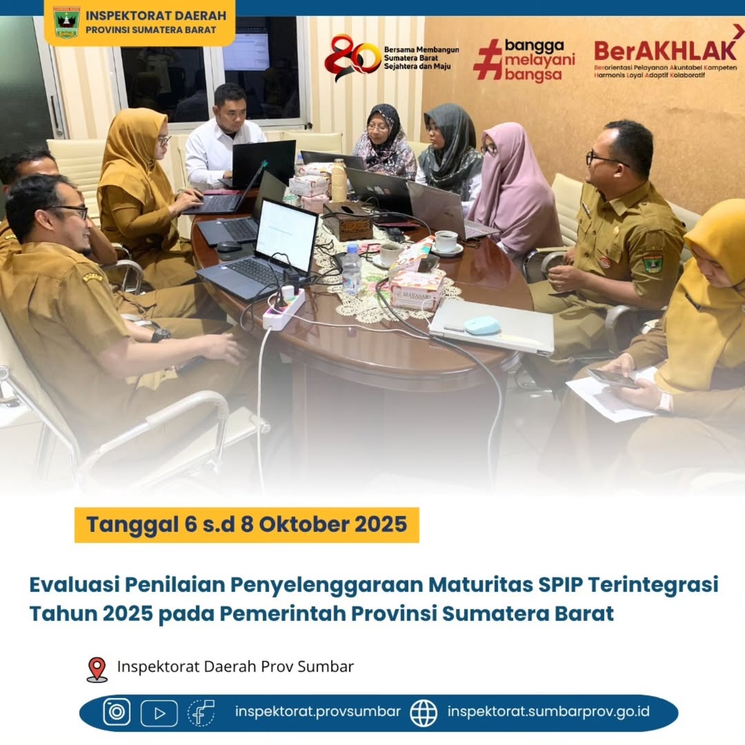 Dalam rangka mendukung terwujudnya tata kelola pemerintahan yang baik (good governance) dan peningkatan akuntabilitas pengelolaan keuangan daerah, telah dilaksanakan Evaluasi Penilaian Penyelenggaraan Maturitas SPIP Terintegrasi Tahun 2025 pada Pemerintah Provinsi Sumatera Barat mulai Senin, 6 Oktober 2025 s.d. Rabu, 8 Oktober 2025 oleh BPKP Perwakilan Provinsi Sumatera Barat.