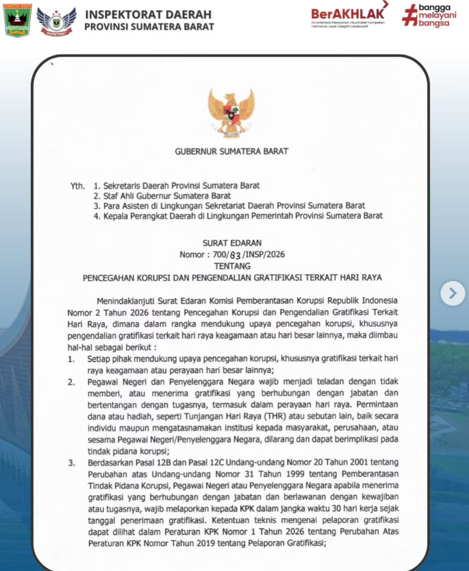 Gubernur Sumatera Barat mengeluarkan Surat Edaran Pencegahan korupsi dan pengendalian gratifikasi terkait hari raya, dengan mengimbau sebagai berikut:
